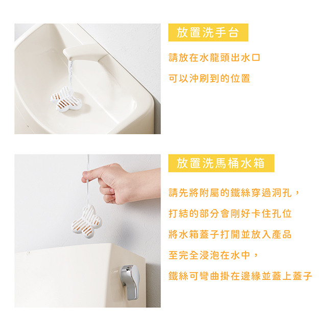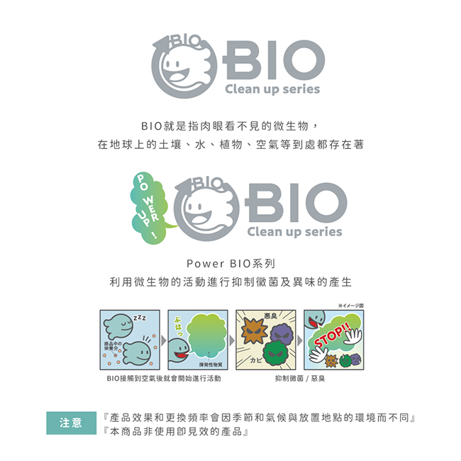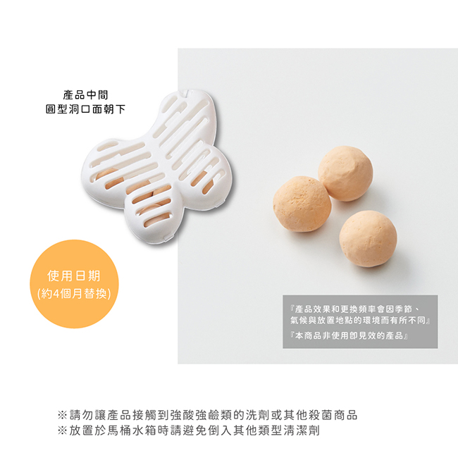˙清掃洗手台時請務必先將本產品移開,絕對禁止讓產品接觸到清潔劑˙本產品不可食用˙請放置在嬰幼兒無法觸及之處˙BIO是一種微生物,其活動會隨著環境變化,效果也會不同˙若該環境造成污垢及惡臭的有機物比較多,除臭效果會比較慢˙請勿讓產品接觸到強酸強鹼類的洗劑或其他殺菌商品;放置於馬桶水箱時請避免倒入其他類型清潔劑,以免BIO效果消失˙因產品特性開封時會有些許味道,會隨著時間變淡,並不影響產品品質˙效果持續時間因使用狀況(水溫、排水量)而不同˙外殼使用環保再生塑膠材質,故外觀會有些許色差和斑點˙請勿使用在其他用途