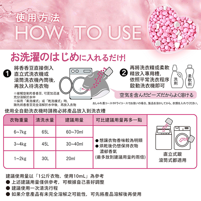 使用方法:① 將香香豆直接倒入直立式洗衣機或滾筒洗衣機內筒後,再放入待洗衣物。