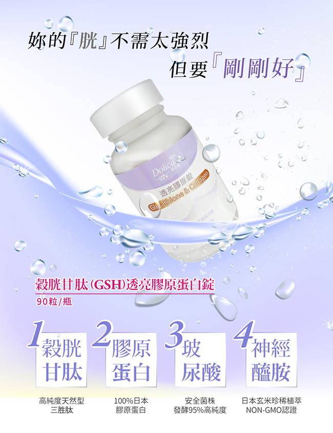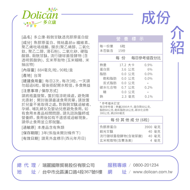 成分:魚膠原蛋白、微結晶狀α-纖維素、聚乙烯?咯烷酮、膜衣(聚乙烯醇、二氧化鈦、聚乙二醇、滑石粉)、二氧化矽、硬脂酸鎂、穀胱甘(月太)、流行鏈球菌發酵物(含透明質酸鈉)、玄米萃取物(玉米糊精、米抽出物)