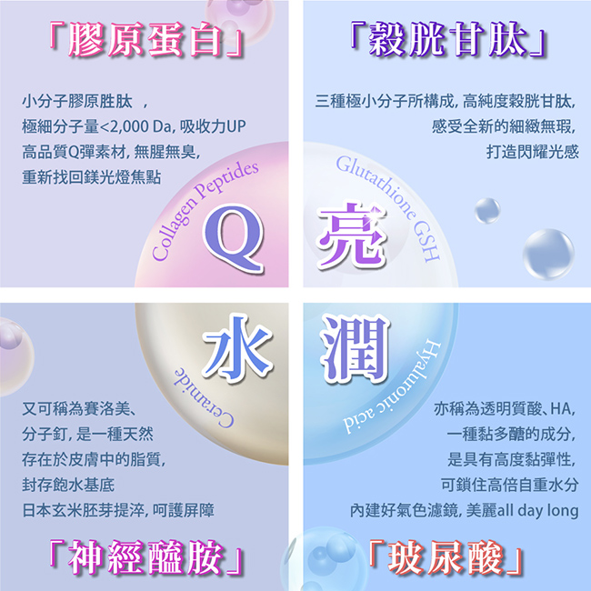 成分:魚膠原蛋白、微結晶狀α-纖維素、聚乙烯?咯烷酮、膜衣(聚乙烯醇、二氧化鈦、聚乙二醇、滑石粉)、二氧化矽、硬脂酸鎂、穀胱甘(月太)、流行鏈球菌發酵物(含透明質酸鈉)、玄米萃取物(玉米糊精、米抽出物)