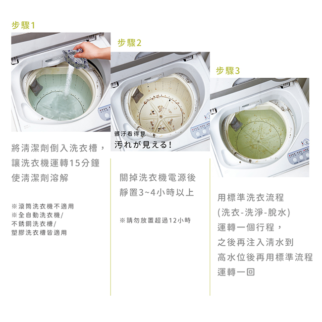 ※髒污非常明顯時可以再多靜置1~2小時 ※髒污非常多時可先用網子撈取 ※請勿放置超過12小時