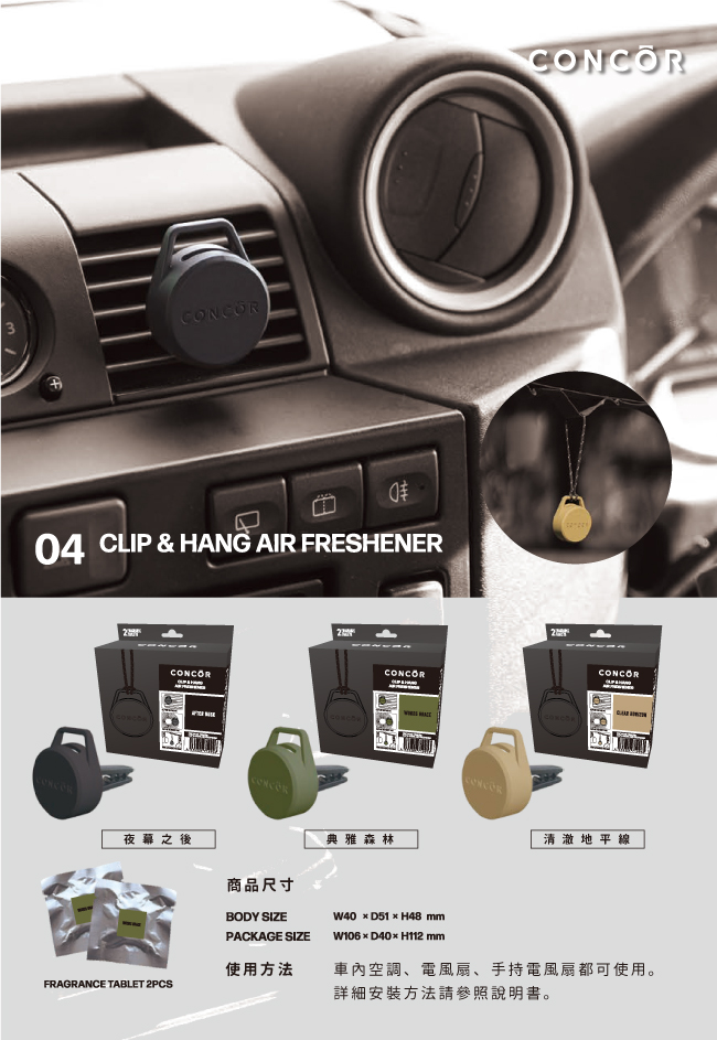 使用方法: 將香氛圈取出並放入內盒,將固定夾裝上,內盒插入圓蓋內,然後順時針轉動直至聽到?嗒聲,牢牢插入出風口位置即可完成。*逆時針轉動可將內盒取出,更換香氛圈