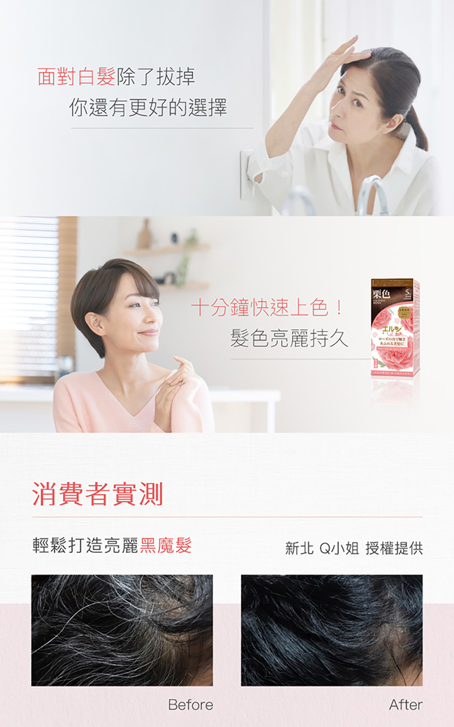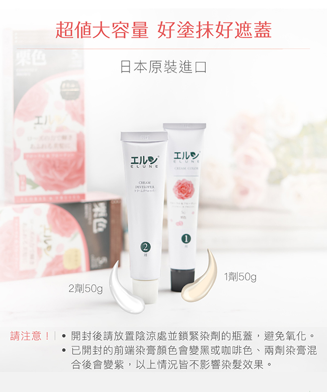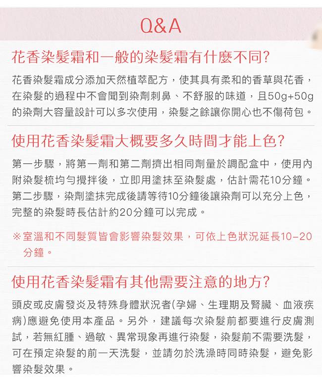 注意事項:每次染髮前皆需做皮膚測試並詳閱說明書內容。不得使用於三歲以下孩童。