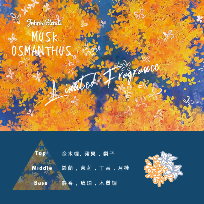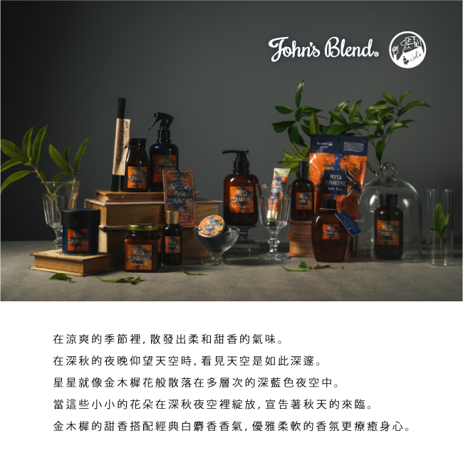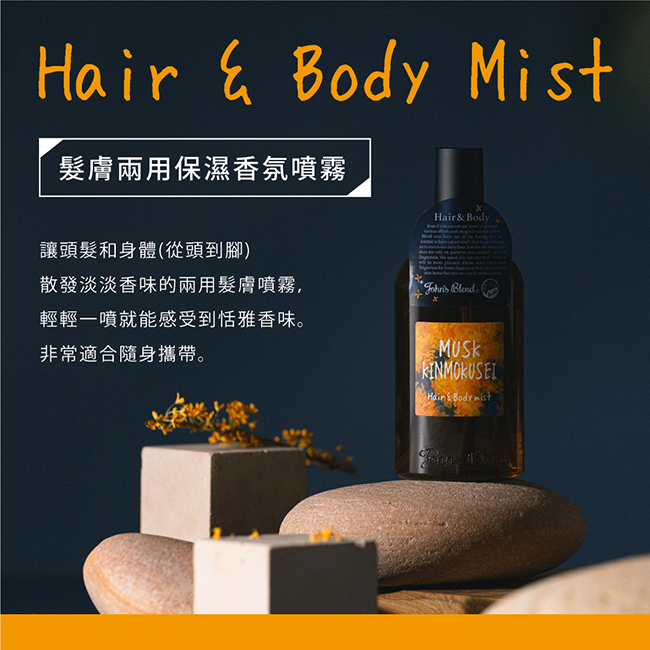 | JOHN'S BLEND/ 髮膚噴霧-金木樨成分: ethanol, water, fragrance, PEG-40 hydrogenated castor oil, ethyl hexyl methoxycinnamate, t-butyl methoxydibenzoylmethane, BHT, sodium lactate, panthenol, lactate tea dry distillation solution, Persimmon Tannin 產地:日本 保存期限:5年 容量:110ml 使用方法:距離身體約5-15公分噴灑在身上後,輕輕均勻抹開。 注意事項:●請勿飲用●若皮膚有異常或不適應症時請停止使用 ●若有誤飲、使用後身體肌膚有異常時,請盡速攜帶本產品就醫 ●不小心進入眼睛時請立即用清水沖洗●若有白色混濁或沉澱為正常情況請安心使用 ●請勿使用在臉部上●請勿做體香噴霧以外的用途   ●請放置於小孩、寵物碰觸不到的地方●使用完請蓋緊瓶蓋●請勿放置於陽光直射、高溫潮濕的地方●請遠離火源 |