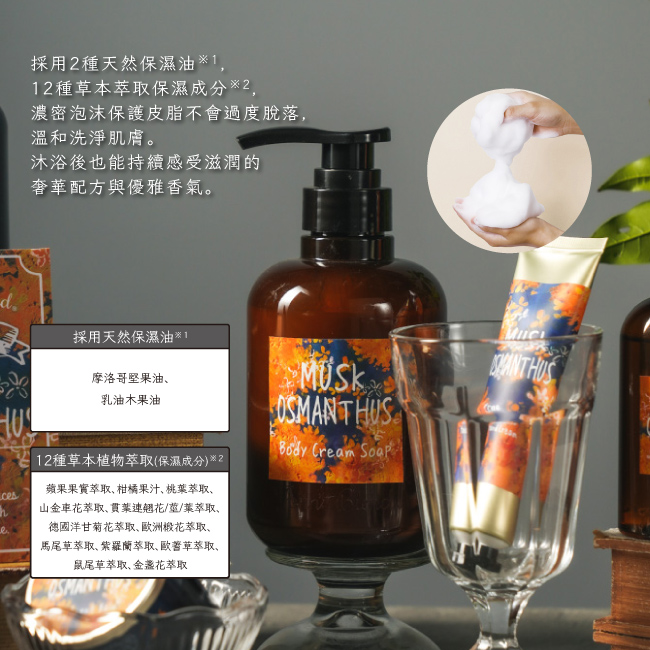 ●成份:Water, Glycerin, Myristic Acid, Lauric Acid, Stearic Acid, Potassium Hydroxide, Glycol Distearate,  Cocamidopropyl Betaine, Palmtic Acid, Fragrance, Gossypium Herbaceum(Cotton) Seed Oil, Sodium Lauroyl Methylaminopropionate, Polyquaternium-51&49, Arnica Montana Flower Extract, Hypericum Erectum Extract, Chamomilla Recutita(Matricaria) Extract, Tilia Cordata Flower Extract, Equisetum Arvense Extract, Malva Sylvestris(Mallow) Flower Extract, Achilea Millefolium Extract, Salvis Officinalis(Sage) Leaf Extract, Calendula Officinails Flower Extract, Argania Spinosa Kernel Oil, Butyrospermum Parkii(Shea) Butter, Beeswax, Disodium EDTA, Tocopherol, Butylene Glycol, Benzoic Acid, Phenoxyethanol