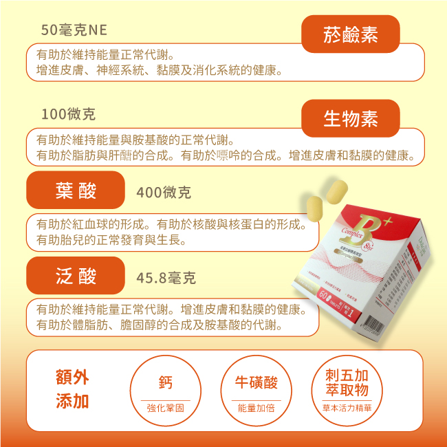 ●成份:乳糖、羥丙基甲基纖維素、維生素B6、維生素B1、本多酸鈣、牛磺酸、菸鹼醯胺、維生素B2、刺五加萃取物(刺五加萃取物、麥芽糊精)、微結晶狀α-纖維素、防潮水性膜衣粉(聚乙烯醇、二氧化鈦、滑石粉、聚乙二醇、大豆卵磷脂)、羧甲基纖維素鈉、複方生物素(麥芽糊精、生物素)、二氧化矽、硬脂酸鎂、食用黃色四號鋁麗基、葉酸、維生素B12