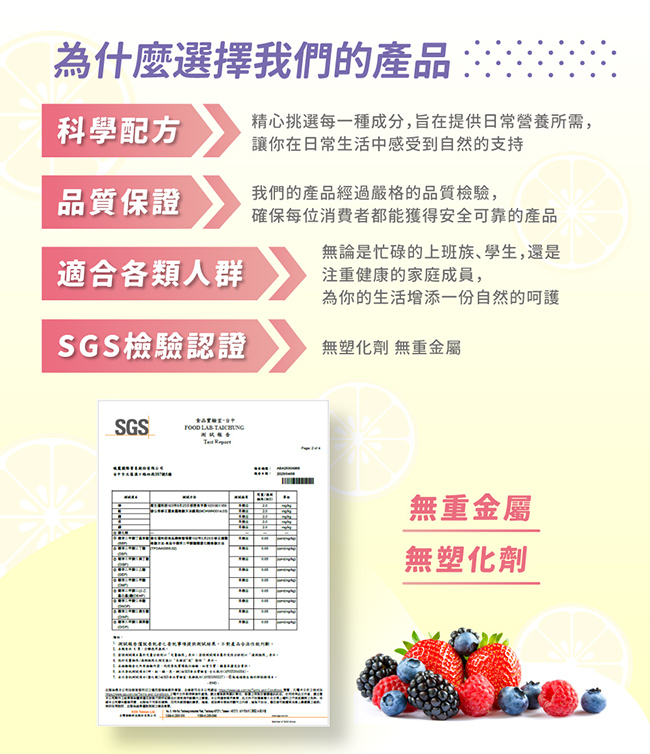 造粒賦型劑(微結晶狀α-纖維素、麥芽糊精)、維生素C、檸檬香料粉(香料、玉米葡萄糖漿、阿拉伯膠)、硬脂酸鎂、二氧化矽、維生素E粉[乙酸dl-α-生育醇酯(維生素E)、乾燥葡萄糖漿、辛烯基丁二酸鈉澱粉、二氧化矽]、余甘子抽出物(余甘子抽出物、麥芽糊精、食鹽、二氧化矽)、硒酵母、綜合莓果萃取物(麥芽糊精、黑莓果粉、黑醋栗果粉、藍莓果粉、草莓果粉、覆盆莓果粉、蔓越莓果粉、巴西莓果粉)、蔗糖素(甜味劑) |